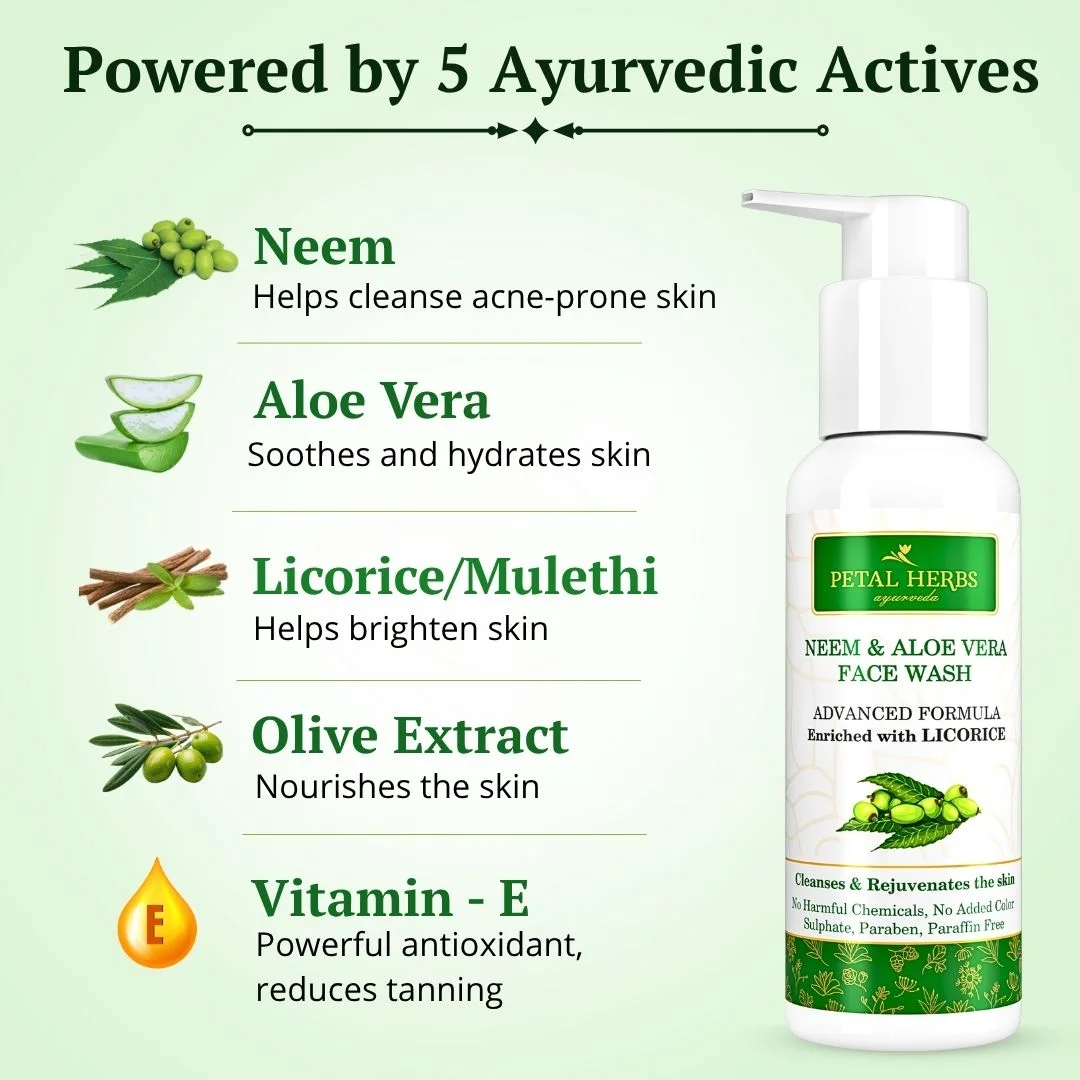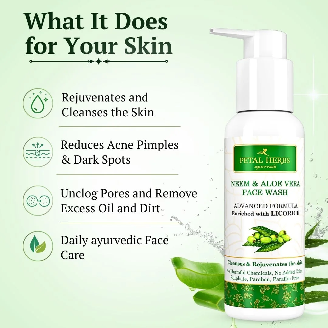 - Sulphate Free Neem Face Wash : Neem & Aloe vera Face Wash rejuvenates and cleanses the skin. Prevents pimples and acne. Helps in scar removal. Removes dead skin cells to give flawless skin. Neem, with its antibacterial properties, helps remove dirt, impurities, and excess oil from pores. This can help prevent breakouts and keep your skin feeling clean and refreshed. Both neem and aloe vera have anti-inflammatory properties that can help reduce redness and inflammation associated with acne. Neem’s antibacterial properties can also fight acne-causing bacteria.